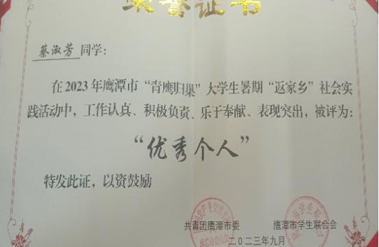 7.2023年“青鹰归巢”返家乡活动中获得“市优秀个人”荣誉证书