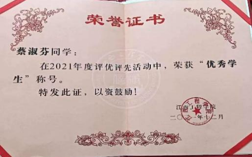 在学习上,她专注于提升自我能力,不断锻炼自身,参与各类技能竞赛。经常与同学一起交流讨论,解决学习过程中遇到的问题。始终保持认真的学习态度,课堂上主动发言,仔细听讲,配合老师教学,勤奋学习、努力进取,提高自己的专业技能水平的同时,做到德、智、体、美、劳等方面全面开花。