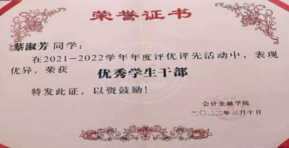 3.2022年获得SUNBET申博“优秀班干部”荣誉证书