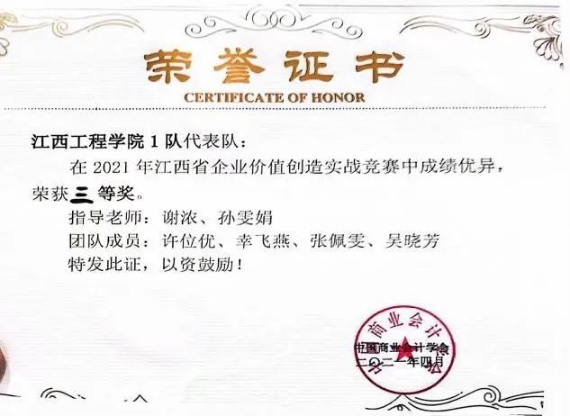 4、在2021年江西省企业价值创造实战竞赛中成绩优异荣获三等奖。