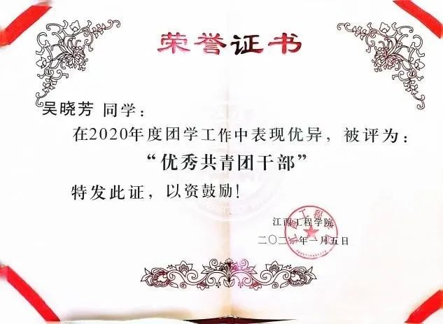 1、在2020年度团学工作中表现优异,被评为“优秀共青团干部”。