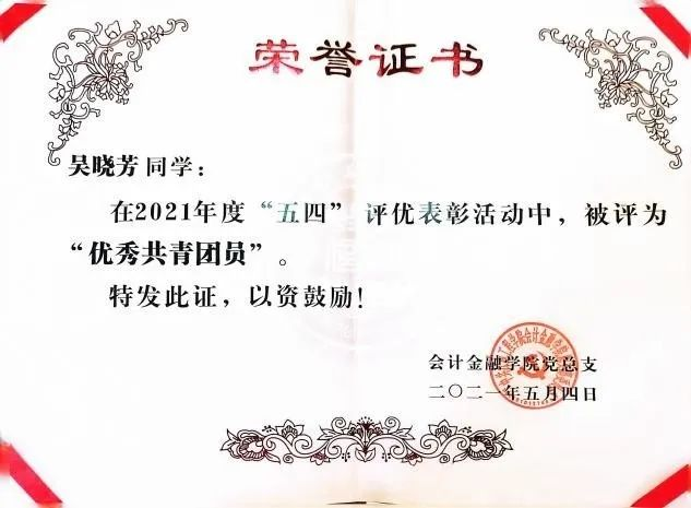 3、在2021年度“五四”评优表彰活动中,被评为“优秀共青团员”。