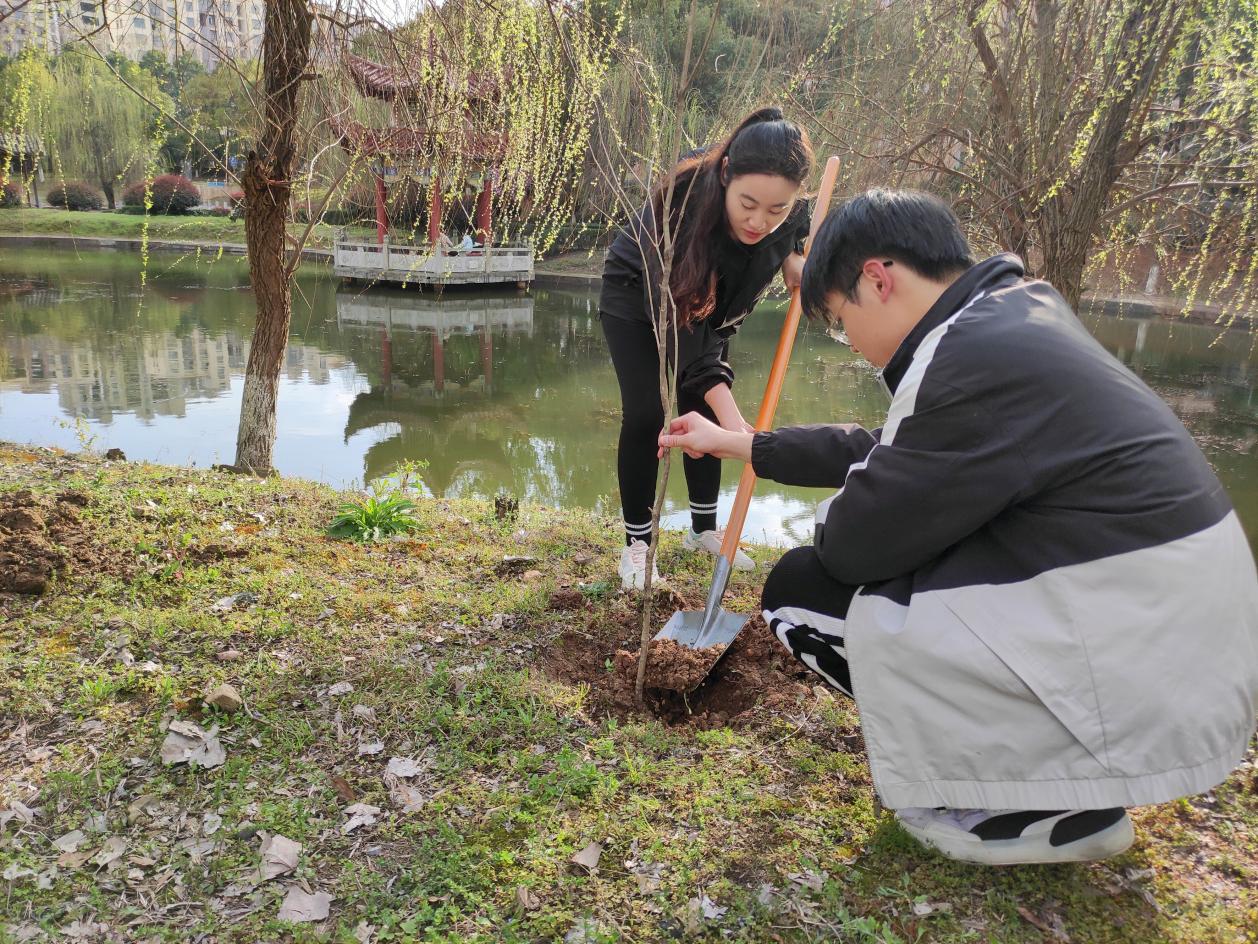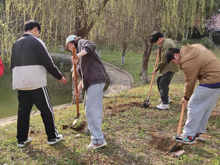 活动当天,怀揣着对植树活动的热情憧憬和美化校园的炽热决心,志愿者们早早就集结在D栋教学楼前,与李桃老师一同开启了这场绿色之旅。活动伊始,组织者深入细致地向志愿者们介绍了植树的各个环节及注意事项,秉持着“植树造林添生态美,播撒绿色让春意长存”的信念,大家迅速投入到了紧张而有序的植树活动中。