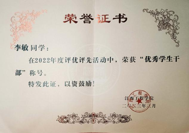 总之,在校期间,学术、思想品质和社会责任感等方面,李敏得到了全面提升。面对未来的挑战和机遇,她将继续保持谦虚谨慎的态度。相信在未来的工作和生活中,她将不断追求卓越,为社会作出贡献,用知识和技能创造更美好的未来。在实现个人价值的同时,为国家和民族的繁荣昌盛,贡献自己的一份力量。