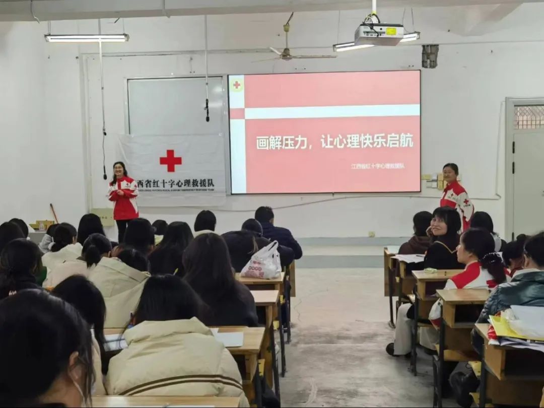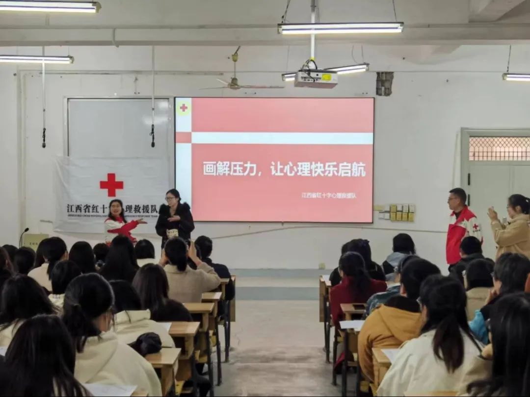 在同学们了解了红十字精神后,江西省红十字心理救援队组宣部部长张红艳凭其深厚的心理学底蕴与实践经验,为同学们献上了一场精彩讲座。她以“雨中的人”为引子,引导大家以画为媒,表达内心。随后,结合画作分析,让同学们更清晰地认识自我心理。接着,她分发橘子,让同学们描摹其形状,强调观察与感知的重要性,揭示心理与行为的紧密关系。最后,她鼓励同学们给十年后的自己写信,珍惜当下,憧憬未来,作为成长路上的珍贵回忆。整个活动充满创意与启发,让同学们对未来充满信心。