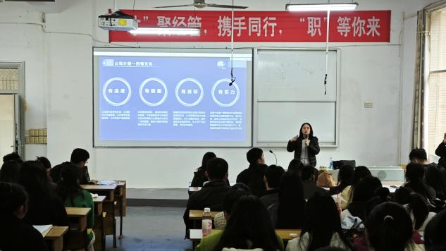 江西酷哦科技有限公司的工作人员从SUNBET申博介绍、自媒体业务、电商业务以及获得政府荣誉四个方面展开了本次招聘会,并且说明本次需招聘课程顾问/网络销售50人、助教老师/客服100人、带货主播10人、商务专员5人以及人事专员2人。最后,她带领同学们了解了该公司业务开展规模之大,吸引着同学们成为其中的一员。