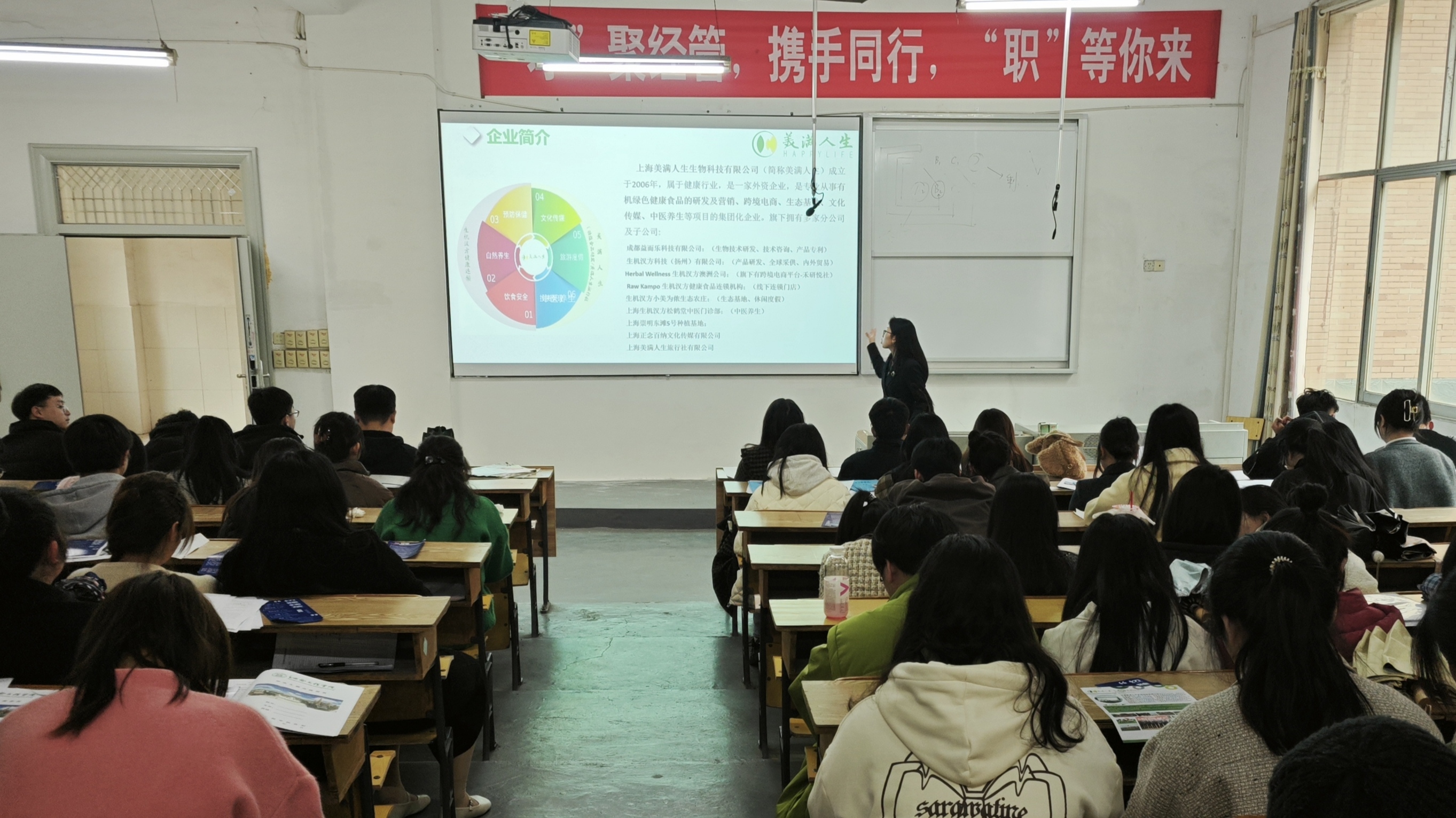 在招聘会上,上海美满人生生物科技有限公司招聘负责人首先为同学们介绍了企业的基本情况,说明了主要招聘岗位以及招聘要求。主要招聘岗位有营销20人,管培20人,财务5人,店长5人。接着具体介绍了各个岗位的薪资待遇和发展前景。然后分享了她在该企业的一些工作经历和在工作中的感受。
