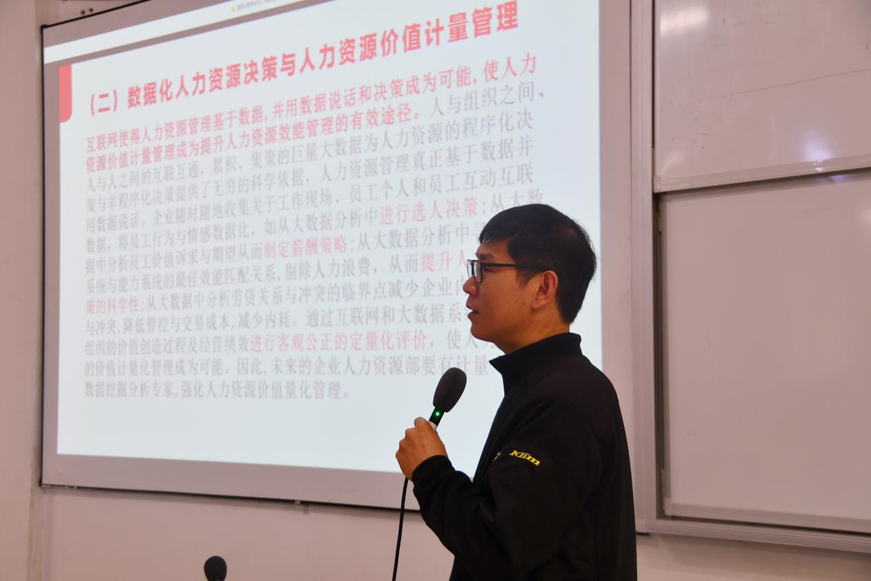 唐林仁副教授,人力资源管理领域的知名专家,中国人力资源开发研究会人才测评分会理事。主讲《人力资源管理》、《培训与开发》、《公司战略与风险管理》等课程。主持江西省社科规划课题1项,省高校人文课题1项,省教育规划课题2项,省高校教改课题1项,省高公司党建课题1项,参与国家级、省厅级课题10余项,发表CSSCI论文3篇,参编教材3部(副主编),获江西省社科优秀成果二等奖1项,宜春市社科优秀成果二、三等奖各1项,具有丰富的教学和研究经验。在本次讲座中,他首先分析了互联网时代企业面临的内外部环境变化,强调了人力资源管理在应对这些变化中的关键作用。他指出,互联网时代的人力资源管理需要从传统的职能导向转变为更加注重员工需求、灵活性和创新性的战略导向。