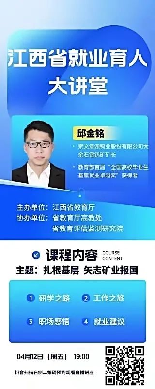 本期特邀教育部首届“高校毕业生基层就业卓越奖”获得者、崇义章源钨业股份有限公司大余石雷钨矿矿长邱金铭围绕《扎根基层 矢志矿业报国》作专题授课。