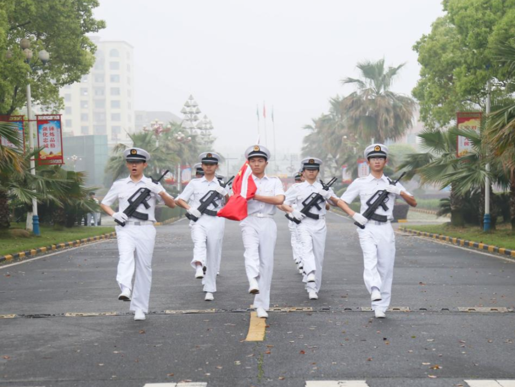 国旗护卫队成员昂首挺胸,迈着坚定的步伐,护送着五星红旗缓缓走向升旗台。在《义勇军进行曲》激昂的旋律中,五星红旗缓缓升起。这一刻,全体师生肃立,向国旗行注目礼。