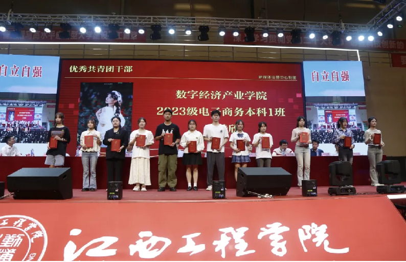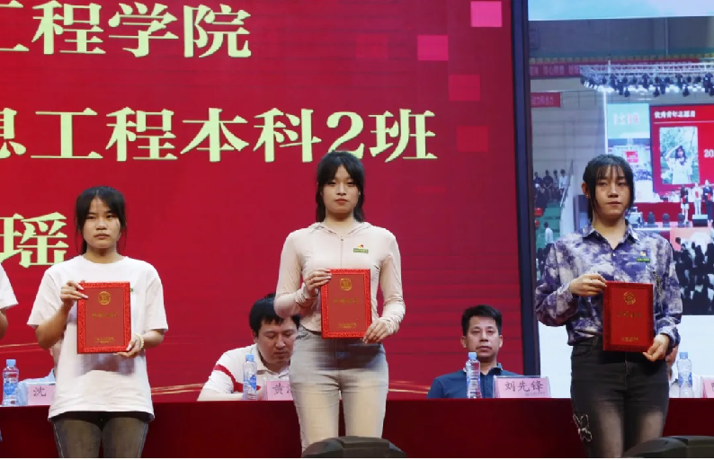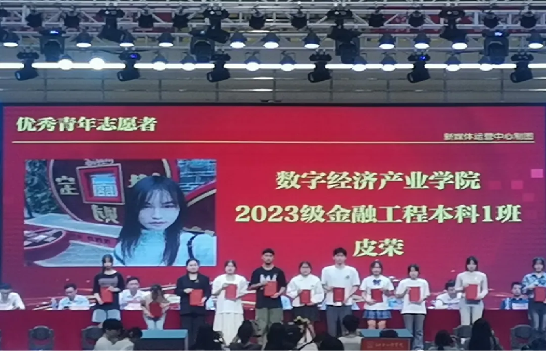 公司员工代表优秀共青团干部2023级电子商务本科1班王季欣、优秀青年志愿者2023级金融工程本科1班皮荣上台领奖。