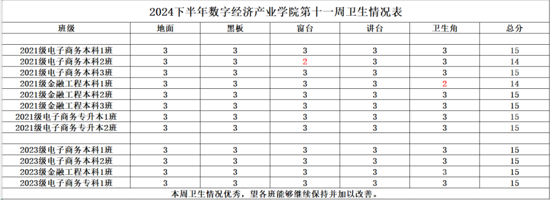 希望表现优秀的班级能够再接再厉,继续保持良好的状态。同时,部分班级也需要加以改进,以提升整体的班级班风水平。我们期待所有班级都能够积极行动起来,为营造一个更加文明、整洁、有序的学习环境而努力。