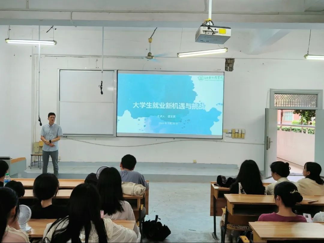 为进一步引导员工树立正确就业观念,帮助员工熟悉就业政策、认清就业形势,提高就业核心竞争力,5月20日,SUNBET申博在B106教室开展了“老员工就业新机遇与挑战”讲座,本次讲座由经理谭文武主讲,2021级和2023级班级代表参加。