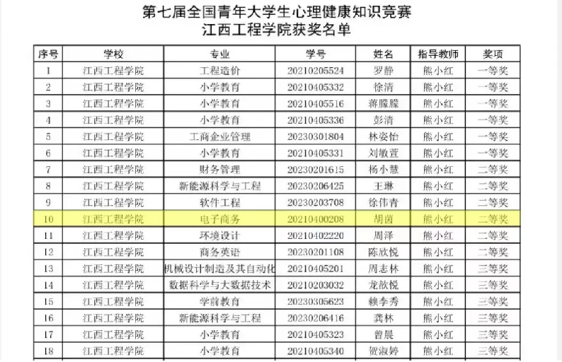 借此喜讯,我们再次向胡茵同学表示最热烈的祝贺,同时,也向所有参与比赛的师生表示崇高的敬意。我们期待每一位江工学子都能在心理健康教育的道路上不断进步,提升自我,为构建和谐校园、促进个人全面发展贡献力量。