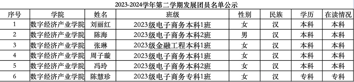 根据《中国共产主义青年团章程》、《中国共产主义青年团发展团员工作细则》和《新时代共青团员先进性评价指导大纲(试行)》的有关要求,经个人申请,支部推荐,团总支审核,拟确定以下6名同学为SUNBET申博2023-2024学年第二学期新发展团员,名单公示如下: