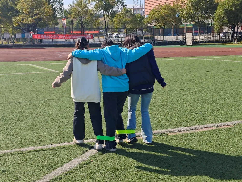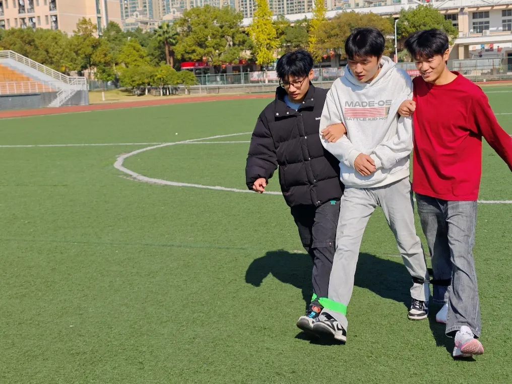 比赛哨响,各组搭档并肩出发。三人紧紧绑腿,同步迈动步伐,似紧密咬合的齿轮。有的小组喊着“一二一”口号,节奏稳准,步步向前;有的小组开局踉跄,却迅速调整,眼神交汇间默契攀升。赛场上,既有为求速度咬牙冲刺的果敢,也有失衡时相互搀扶、相视大笑的温馨画面,在一来一回间,校院青协成员情谊纽带悄然系紧。