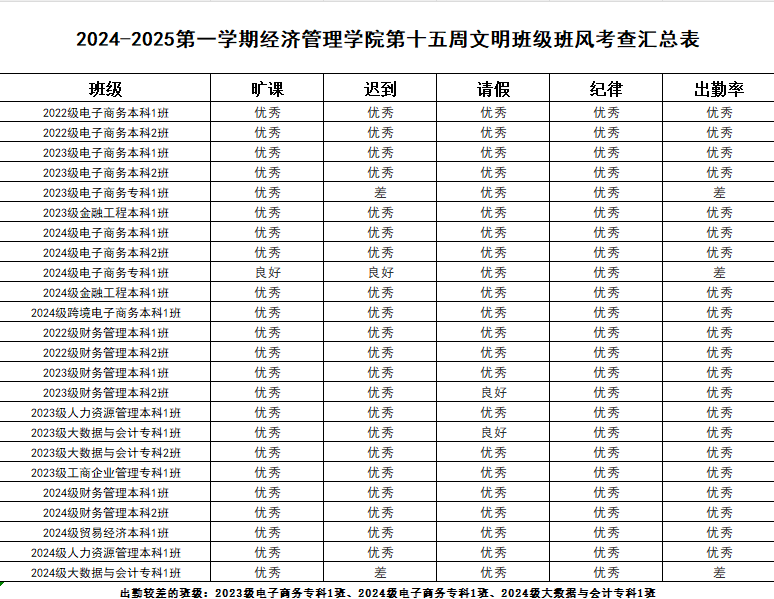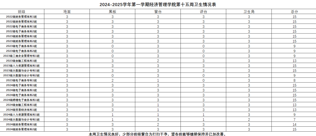 希望表现优秀的班级能够再接再厉,继续保持良好的状态。同时,部分班级也需要加以改进,以提升整体的班级班风水平。我们期待所有班级都能够积极行动起来,为营造一个更加文明、整洁、有序的学习环境而努力。