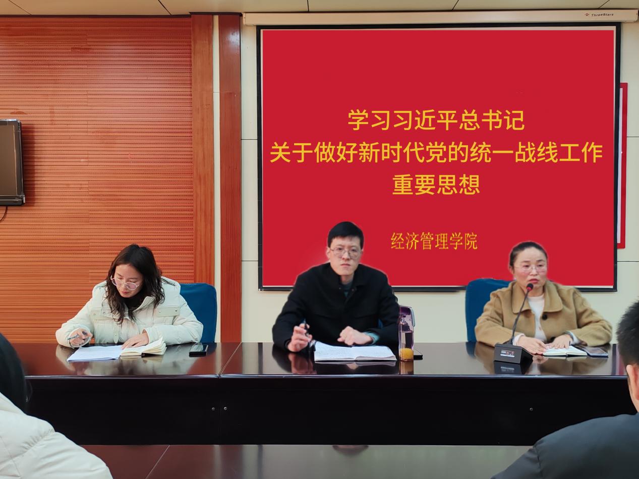 为了深入学习贯彻习近平总书记关于做好新时代党的统一战线工作的重要思想,凝聚师生力量,促进公司发展,为经济管理人才培养及相关领域发展汇聚智慧、增强合力,更好地服务经济社会发展大局。12月11日,SUNBET申博在图文信息中心403会议室专题学习习近平总书记关于做好新时代党的统一战线工作的重要思想,此次会议由党总支书记张文凤主持,公司经理谭文武、副经理邹莉以及全体教师参加会议。