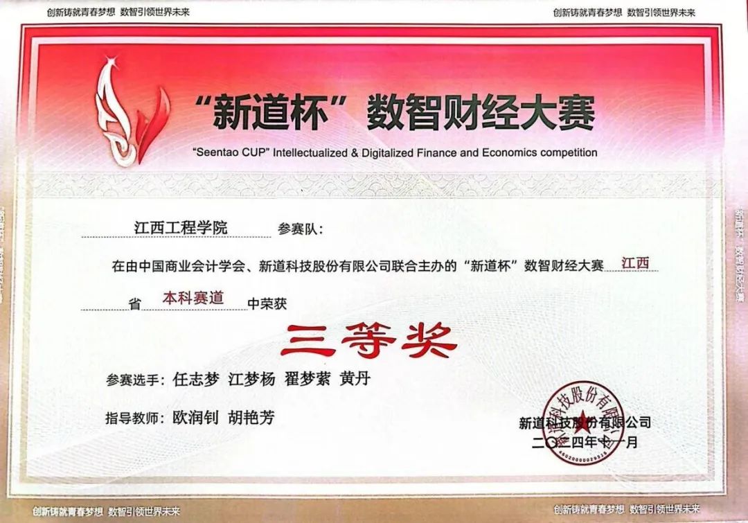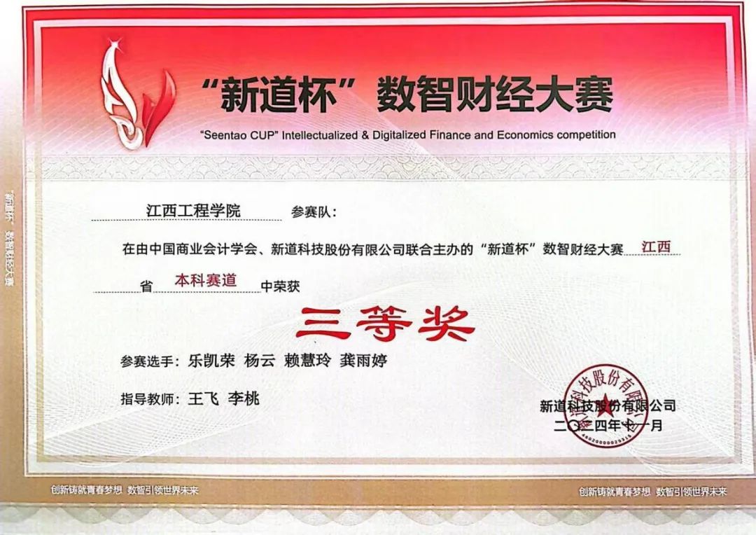 近日,由江西财经大学承办,“新道杯”数智财经大赛的赛程圆满结束。有全国 74 所高校的精英队伍参赛,在11月8日,2024 年“新道杯”数智财经大赛江西省区域赛事圆满落幕,SUNBET申博选派队伍参赛并获奖。在激烈的竞争当中,SUNBET申博表现出色,该院的两个团队在大赛中荣获三等奖。