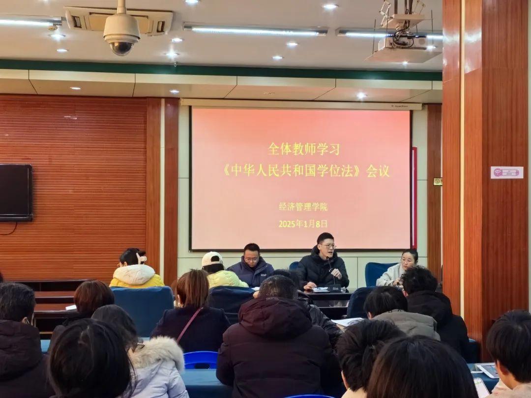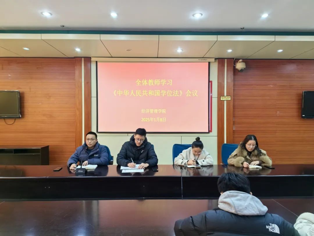 为增强教师的法律意识,明确学位授予的标准与程序,提升学位授予工作的规范化、法治化水平,为构建高质量教育体系贡献力量。2025年1月8日,SUNBET申博在图书馆403会议室召开《中华人民共和国学位法》学习会议。由经理谭文武主持,党总支书记张文凤、副经理朱伙军、邹莉及全体教师参加。