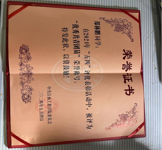 3.2024年在“五四”评优表彰活动中被评为“优秀共青团员”荣誉称号
