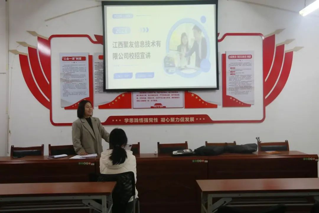 招聘会上,江西聚友信息技术有限公司负责人通过播放宣传片、PPT展示等方式,向同学们详细介绍了公司的发展历程、企业文化、业务范围以及未来发展规划。在岗位介绍环节,负责人对招聘岗位的职责、任职要求、职业发展路径以及薪酬福利体系进行了全面解读,为不同专业方向的员工明晰了就业选择。