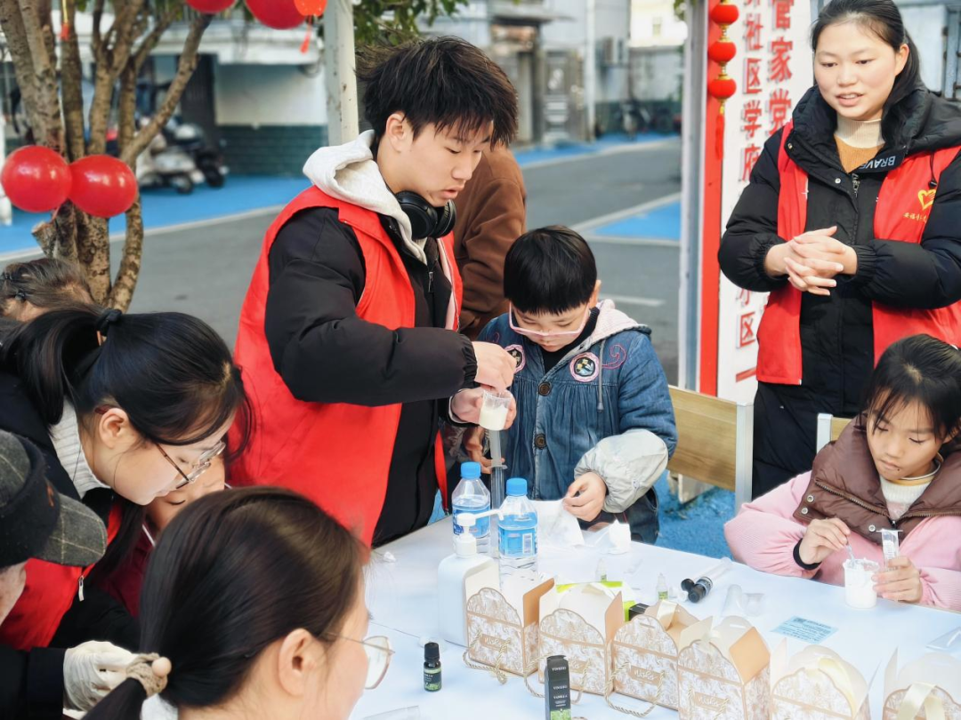 在实践时,我们深入到社区居民群众当中去,通过一系列的手工小游戏增进与社区群众的联系,活动中的小朋友们通过自己的努力制作了护手霜,每个人的脸上都洋溢着快乐的笑容,他们脸上的笑容是对我们工作最好的肯定。
