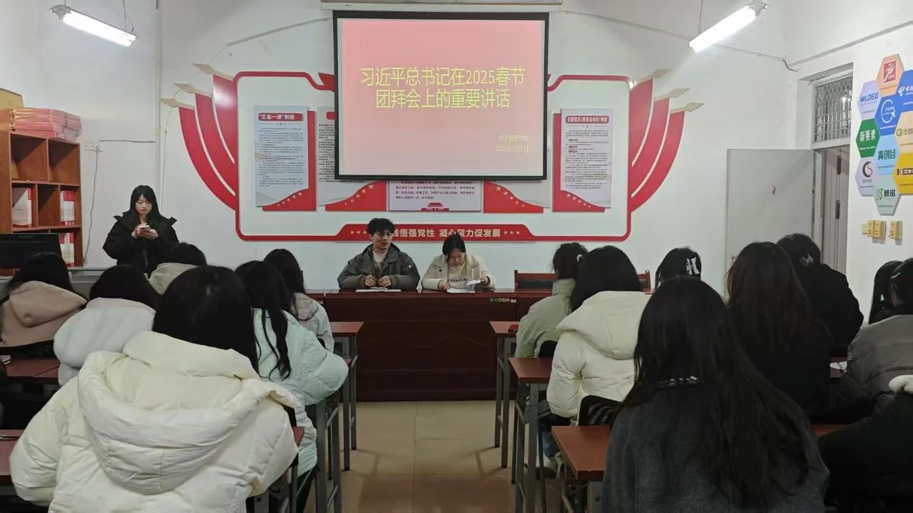 会议伊始,胡文秀书记详细阐明了习近平总书记在春节团拜会上的讲话背景与重要意义。她告诉学子们,总书记的讲话总结了过去一年我国在各领域取得的显著成就,同时也为新一年的发展指明了方向。这对于鼓舞全国人民团结奋斗、推进中国式现代化建设具有重大指导作用。随后,陈鹏书记带领全体参会人员共同研读讲话原文,深入领会讲话精神。从经济回暖向好、科技创新成果丰硕,到民生保障有力、国际影响力提升,大家都深刻感受到了过去一年国家发展的坚实步伐。