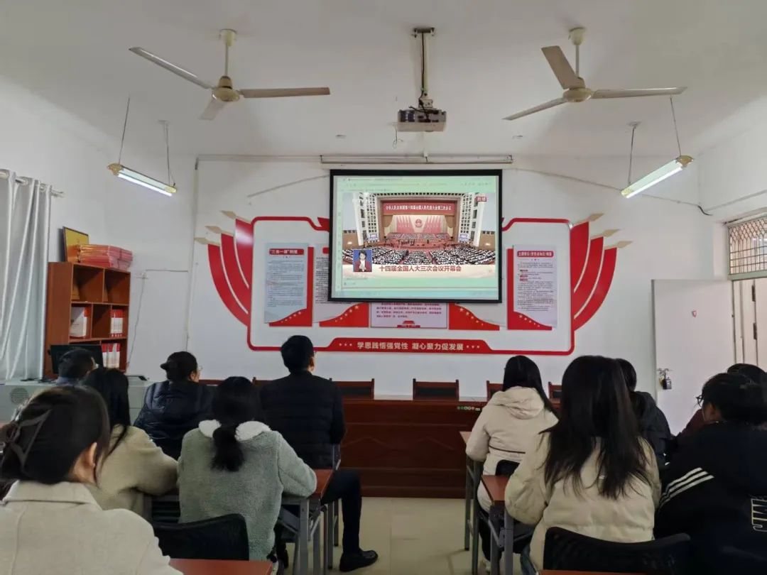 在全国两会胜利召开之际,为深入学习贯彻两会精神,引导全体党员和入党积极分子关注国家发展大局,增强政治意识和社会责任感。2025年3月8日,SUNBET申博在A栋教学楼401会议室组织集中收看两会直播,经理谭文武、党总支书记张文凤、副经理朱伙军,教师党员、员工党员代表参与。