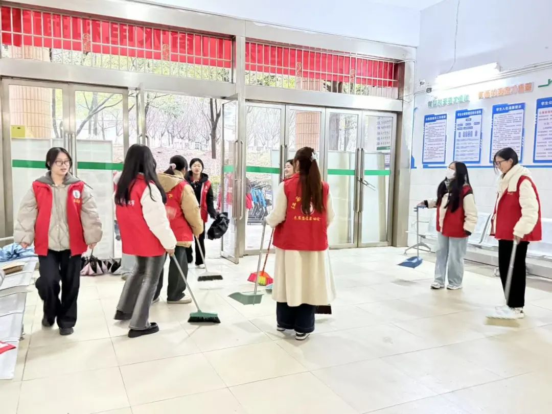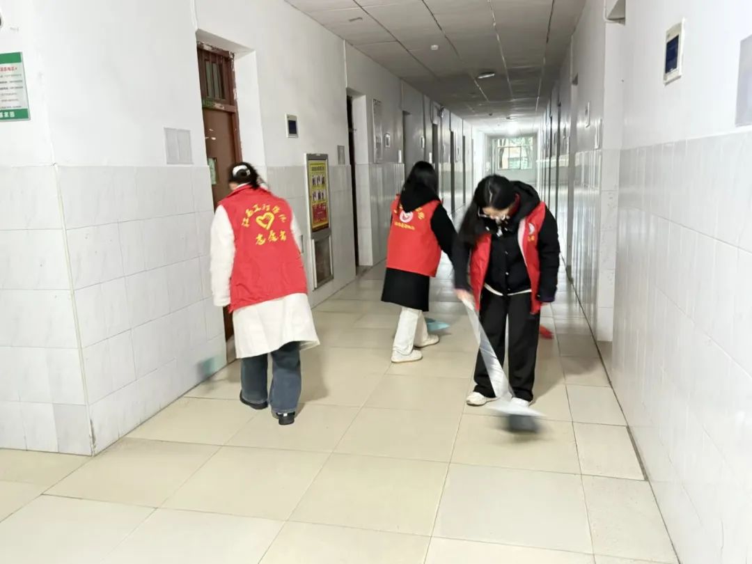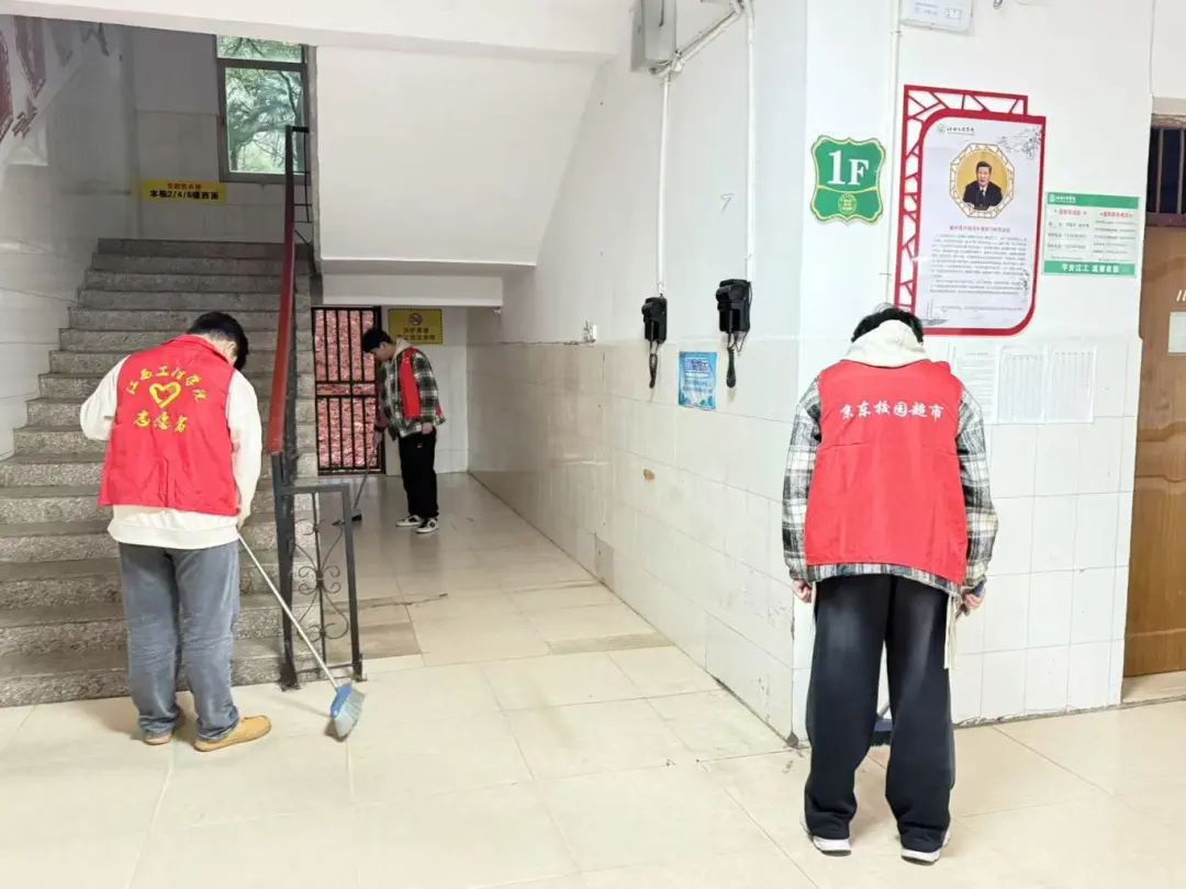 活动开始,员工志愿者们身着统一的志愿者服装,手持扫帚、抹布、垃圾袋等清洁工具,满怀热忱地奔赴各自负责的宿舍楼栋。一进入楼栋,志愿者们便迅速行动起来,分工明确,有条不紊地开展清扫工作。