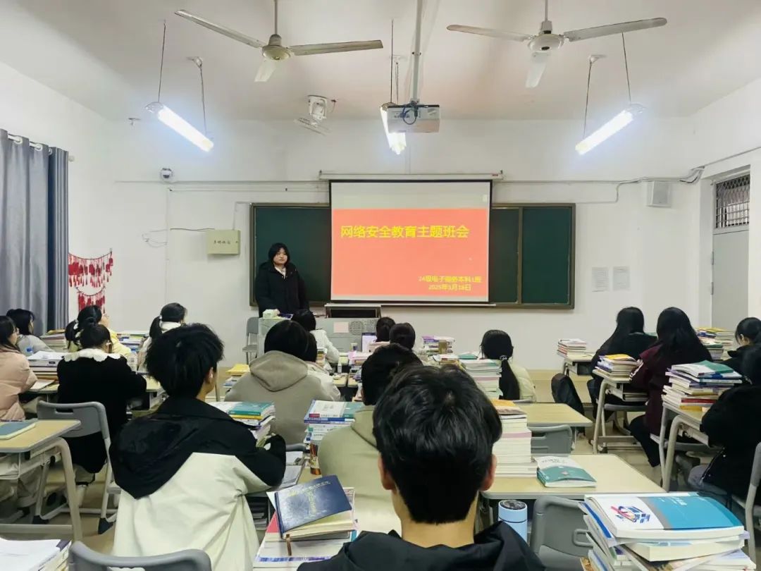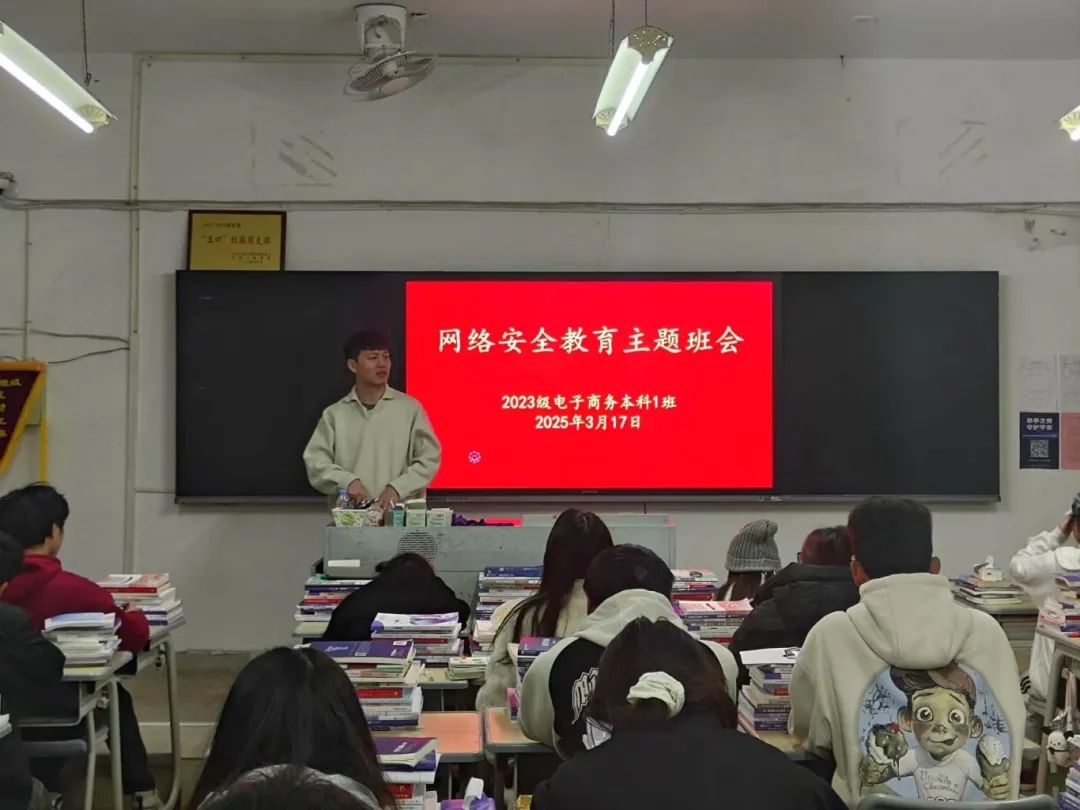 班会伊始,辅导员(班主任)利用精心制作的PPT,以生动直观的方式,深入浅出地讲解了网络诈骗的种种常见手段。从虚假的兼职信息到狡猾的网络交友骗局等一个个鲜活的真实案例。辅导员(班主任)结合专业知识,剖析网络安全对个人信息保护、金融安全的重要性,并分享实用防范方法,如设置强密码、谨慎对待公共WiFi等,让同学们深刻体会到了网络风险的隐蔽性和危害性。