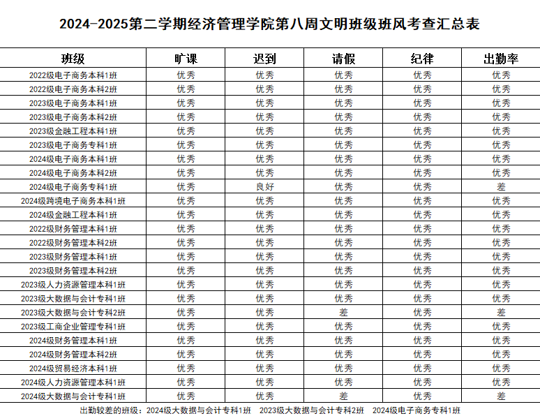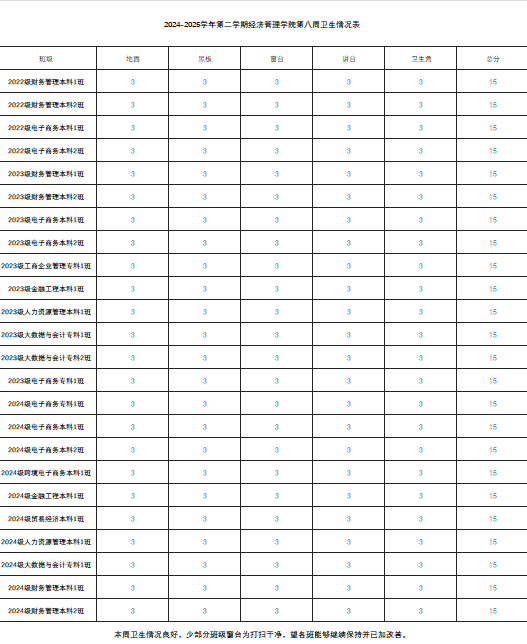 希望表现优秀的班级能够再接再厉,继续保持良好的状态。同时,部分班级也需要加以改进,以提升整体的班级班风水平。我们期待所有班级都能够积极行动起来,为营造一个更加文明、整洁、有序的学习环境而努力。