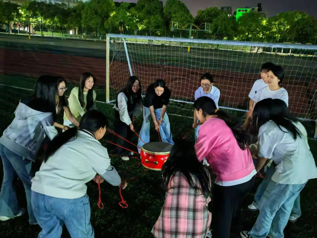 接着进行的击鼓传球游戏更是将活动推向了高潮。特制的大鼓被多根绳索牵引,同学们各自拉住绳索,合力控制鼓面。在有节奏的鼓声中,橙色小球迅速传递,大家屏气凝神,全神贯注,生怕在自己手中停下。