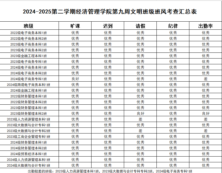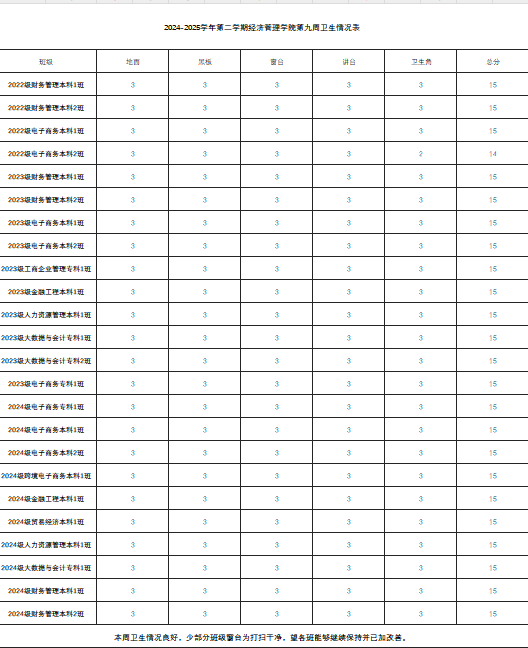 希望表现优秀的班级能够再接再厉,继续保持良好的状态。同时,部分班级也需要加以改进,以提升整体的班级班风水平。我们期待所有班级都能够积极行动起来,为营造一个更加文明、整洁、有序的学习环境而努力。