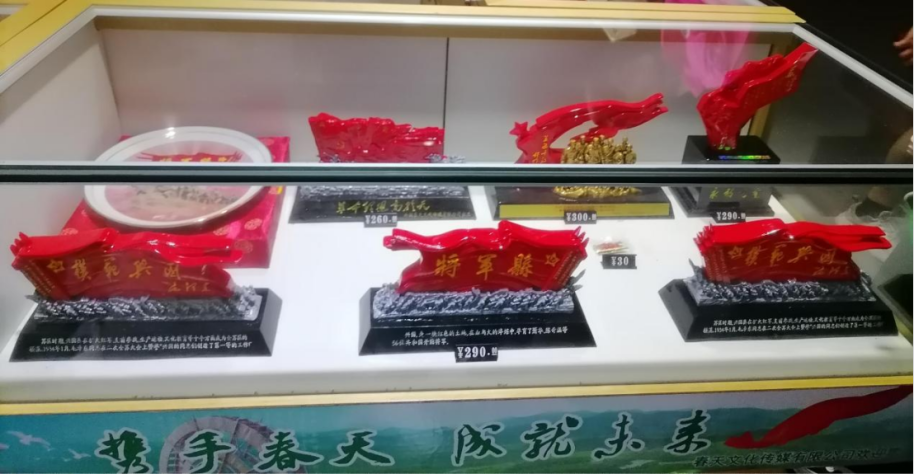 唐欢同学来到玻璃展柜旁,展柜中白色瓷盘上的革命纹样与红色雕塑群构成视觉焦点。标价牌上的数字在革命符号旁显得突兀——260元的火炬雕塑、300元的红旗摆件,这些市场化定价的纪念品将革命记忆转化为可触摸的商品。广场中央的“携手春天 成就未来”横幅与两侧火炬雕塑,在春日阳光下折射出双重光芒:既是对革命年代的致敬,更是对新时代的期许。这种历史符号的商品化转译,恰似革命精神在当代社会的创造性转化。