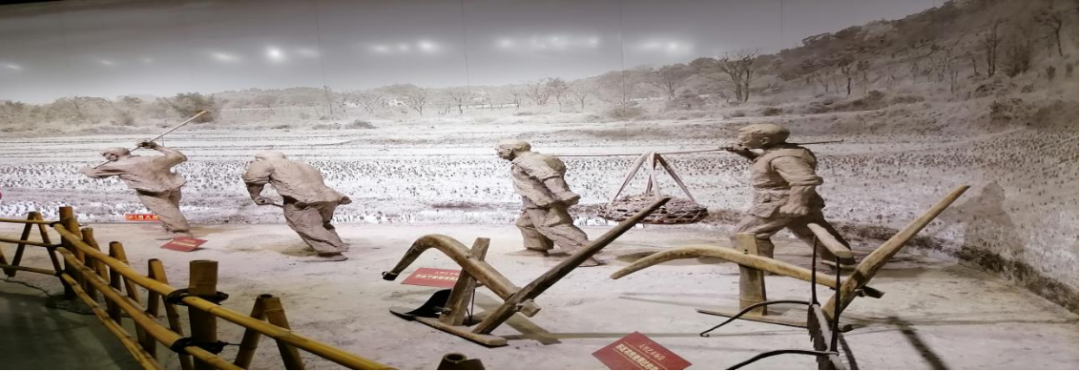 她走进竹制围栏圈起的农耕场景里,四尊农民雕像凝固了千年农耕文明的基因密码。弯腰扶犁的老农、肩挑扁担的壮汉、手持镰刀的妇女,这些被岁月风干的形象在展柜灯光下重获新生。地上的犁铧与耙具泛着幽光,仿佛还能听见土地深处的呼吸。背景壁画里层层叠叠的稻浪,与将军墙上星罗棋布的将星形成奇妙呼应——正是这些面朝黄土背朝天的普通人,用血肉之躯托举起革命的参天大树。当城市观众驻足凝视这些农具时,某种跨越时空的生命共振悄然。
