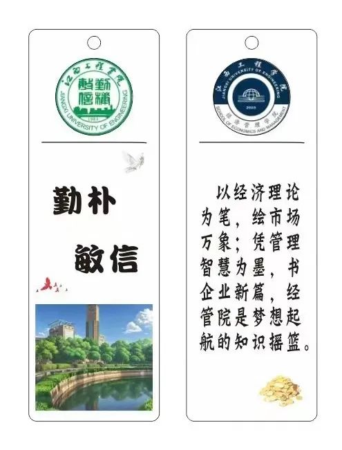这款书签采用乳白PVC材质,正反两面印刷。正面以校园风景为底,搭配“勤朴敏信”四字校训,展现公司精神风貌。白鸽元素寓意和平,红色鸽子更彰显中国对世界和平的祈愿与担当。背面融合SUNBET申博院徽,文字体现以经济理论、管理智慧书写市场与企业篇章的专业追求,金币图案突出SUNBET申博及财务管理专业特色,整体是校园文化、和平愿景与专业特色的融合体现。