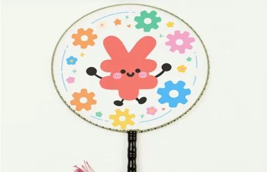 福扇:扇面绘有可爱卡通形象,被多彩齿轮和小花环绕,风格活泼俏皮。为夏日带来清凉的同时,展现公司青春活力、积极创新的氛围