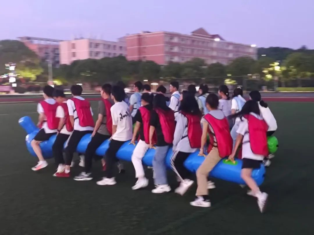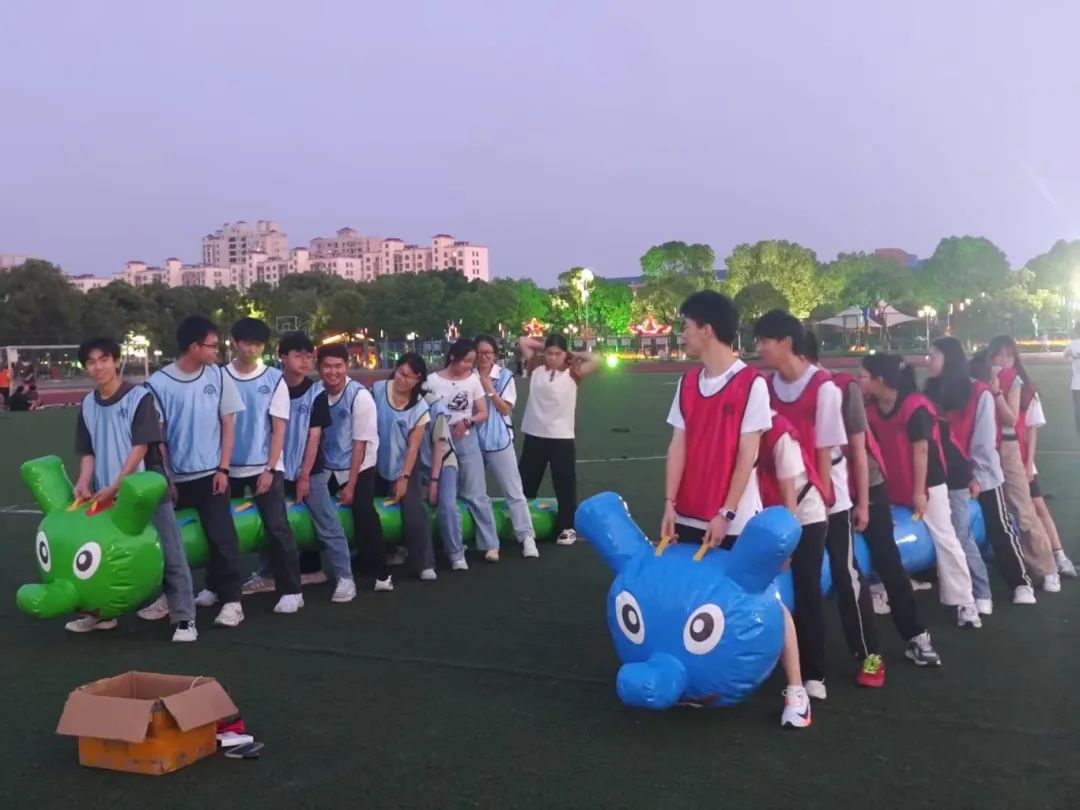 同学们骑乘充气“毛毛虫”,喊着统一口号向50米终点冲刺。规则严格考验团队配合——拖拉器械、脱手或抢跑均会加时。各组选手步伐一致,在加油声中冲向胜利。