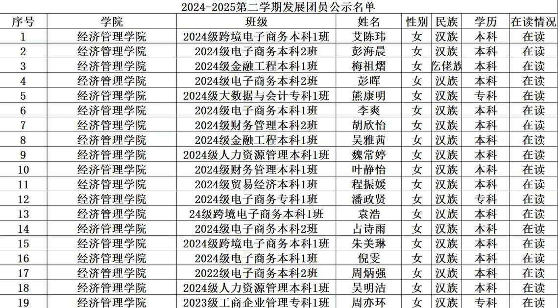 根据《中国共产主义青年团章程》、《中国共产主义青年团发展团员工作细则》和《新时代共青团员先进性评价指导大纲(试行)》的有关要求,经个人申请,支部推荐,团总支审核,拟确定以下19名同学为2024-2025学年第二学期新发展团员,名单公示如下: