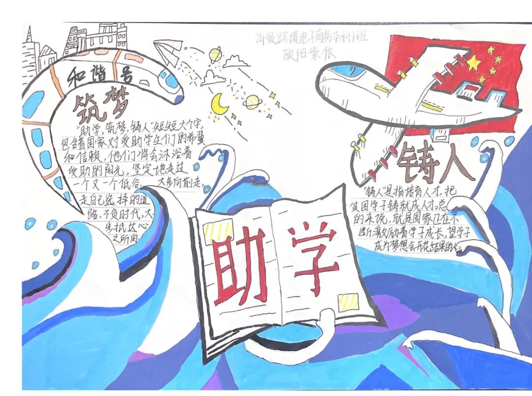 欧阳紫依同学的作品色彩鲜艳、视觉冲击力强。手抄报中“和谐号”“飞机”等元素,结合“助学、筑梦、铸人”的文字阐释,表达了国家对受助员工的期望与信赖,寓意着学子在资助的推动下,坚定迈向梦想彼岸,展现出积极向上的精神风貌.