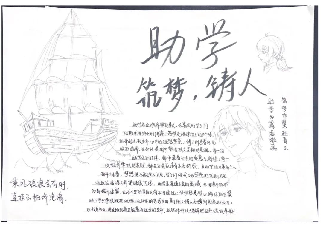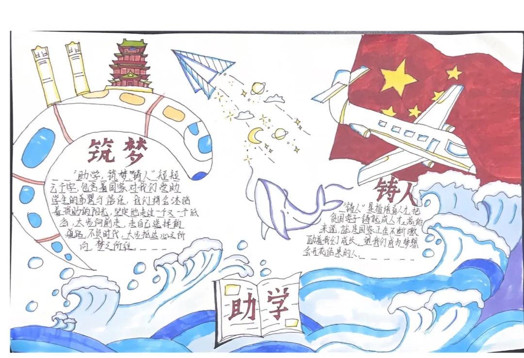 郑国玉同学的手抄报以“助学筑梦,铸人”为主题,画面中帆船元素寓意着受助学子在知识海洋中乘风破浪。文字部分深刻阐述了助学如灯塔,照亮求学之路;筑梦似羽翼,助力理想腾飞;铸人若春雨,滋养灵魂成长。展现了资助政策为学子带来的希望与力量,激励大家在逐梦路上奋勇前行。