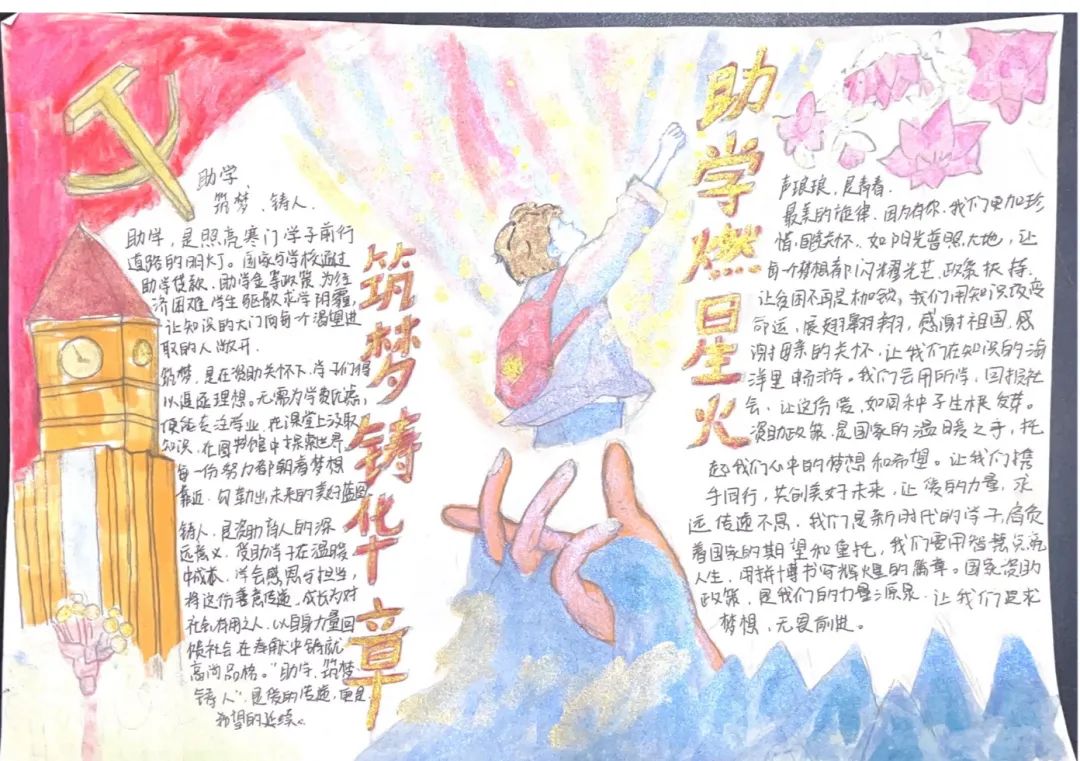 毕心婷同学的手抄报以“助学燃星火,筑梦铸华章”为核心。画面中党旗、钟楼等元素,搭配充满激情的文字,展现了助学如明灯照亮寒门学子路,筑梦让理想照进现实,铸人使学子在温暖中成长为有用之才的主题。传递出对国家资助政策的感恩,以及立志回报社会的信念。