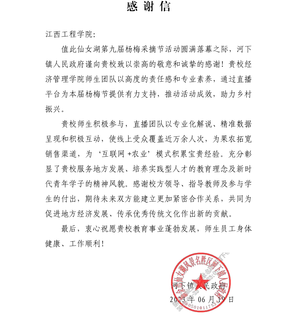 数据显示,活动期间超8000人到场品鉴采摘,近5000名网友线上观看直播,仙女湖杨梅品牌知名度与市场影响力显著提升。河下镇人民政府在6月19日发来的感谢信中提到:“直播团队以专业化解说、精准数据呈现和积极互动,使线上受众覆盖近万余人次,为果农拓宽销售渠道,为‘互联网 +农业’模式积累宝贵经验。”