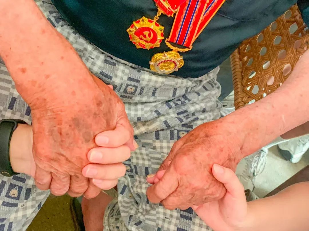 快门按下的瞬间,我们紧紧握住爷爷的手——他像一棵饱经风雨却依旧苍劲的老树,98岁的身躯稳稳坐在中间,笑意温和又明亮;我们围在身旁,笑容里藏着深深的敬佩,更暗涌着接过历史接力棒的坚定。
