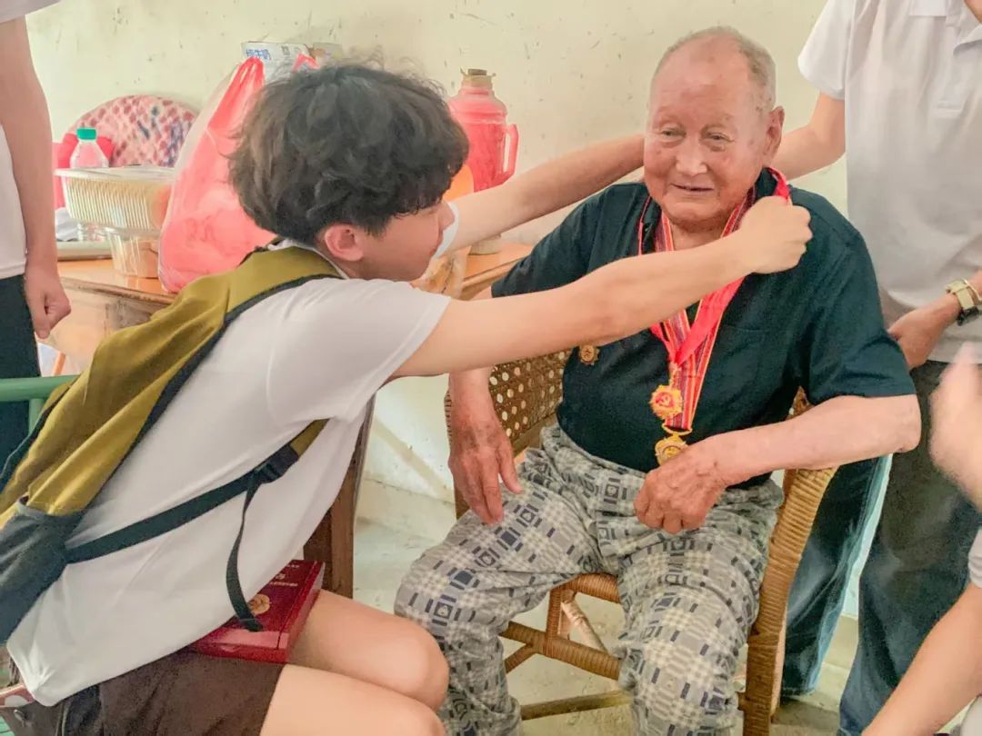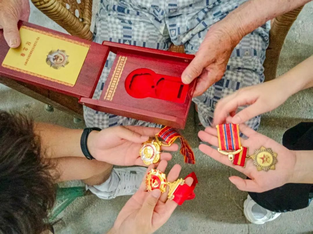 聊天过半,我们提议和爷爷合张影,爷爷爽快应下。他用布满皱纹的手小心抚过勋章,慢慢理正绶带,胸膛挺得笔直。队员们见状,也轻轻上前,帮着抚平绶带的褶皱,调整勋章的位置,动作里满是细致与恭敬。