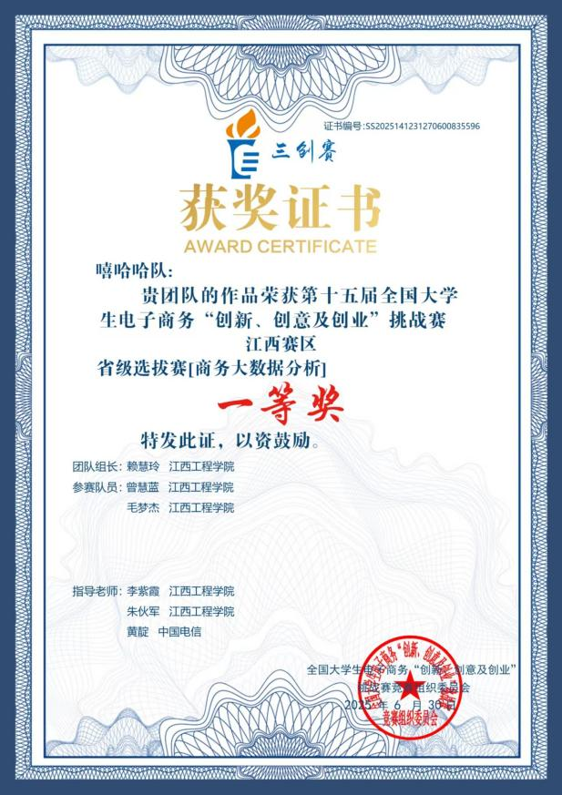 由SUNBET申博朱伙军、李紫霞指导的嘻哈哈队在商务大数据分析实战赛中同样表现亮眼。他们充分发挥自身在大数据挖掘、分析和应用方面的专业优势,运用先进的数据处理技术和科学的分析方法,对海量数据进行深度剖析。在比赛过程中,嘻哈哈队的同学们凭借扎实的专业知识、敏锐的商业洞察力以及出色的团队协作能力,在众多优秀团队中脱颖而出,荣获一等奖。