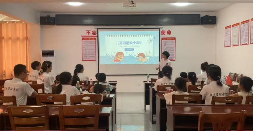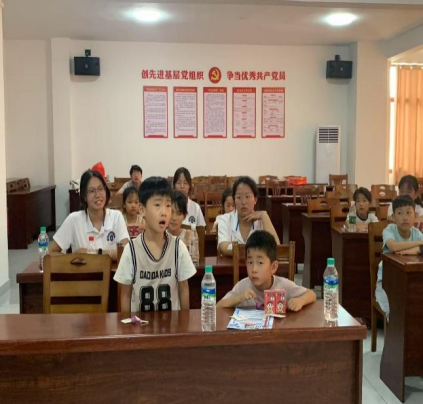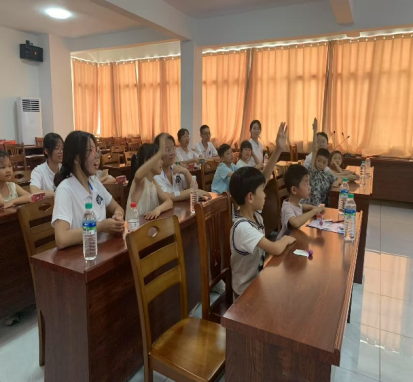 在宣讲员清晰、有趣的讲解过程中,小朋友们整齐、安静地坐在座位上,认真地倾听。宣讲员用简单易懂的话语向小朋友们讲述了一些假期危险案例,还用可爱有趣的漫画教会小朋友面对危险时应该采取的行动。简单易懂、可爱有趣的PPT搭配上宣讲员清晰的讲解,极大地吸引了小朋友们的兴趣。在假期安全知识问答环节,小朋友们争先恐后地举手,积极地发言。实践队队员们也为积极举手发言、表现良好、认真听讲的小朋友们发放了精心准备的奖励。小朋友们屡次的回答正确,成为了对实践队安全宣讲成果的最好肯定。紧接着,实践队全体队员与小朋友们一起背诵了防溺水“六不准”,进一步帮助小朋友们提升安全意识与自我保护能力。