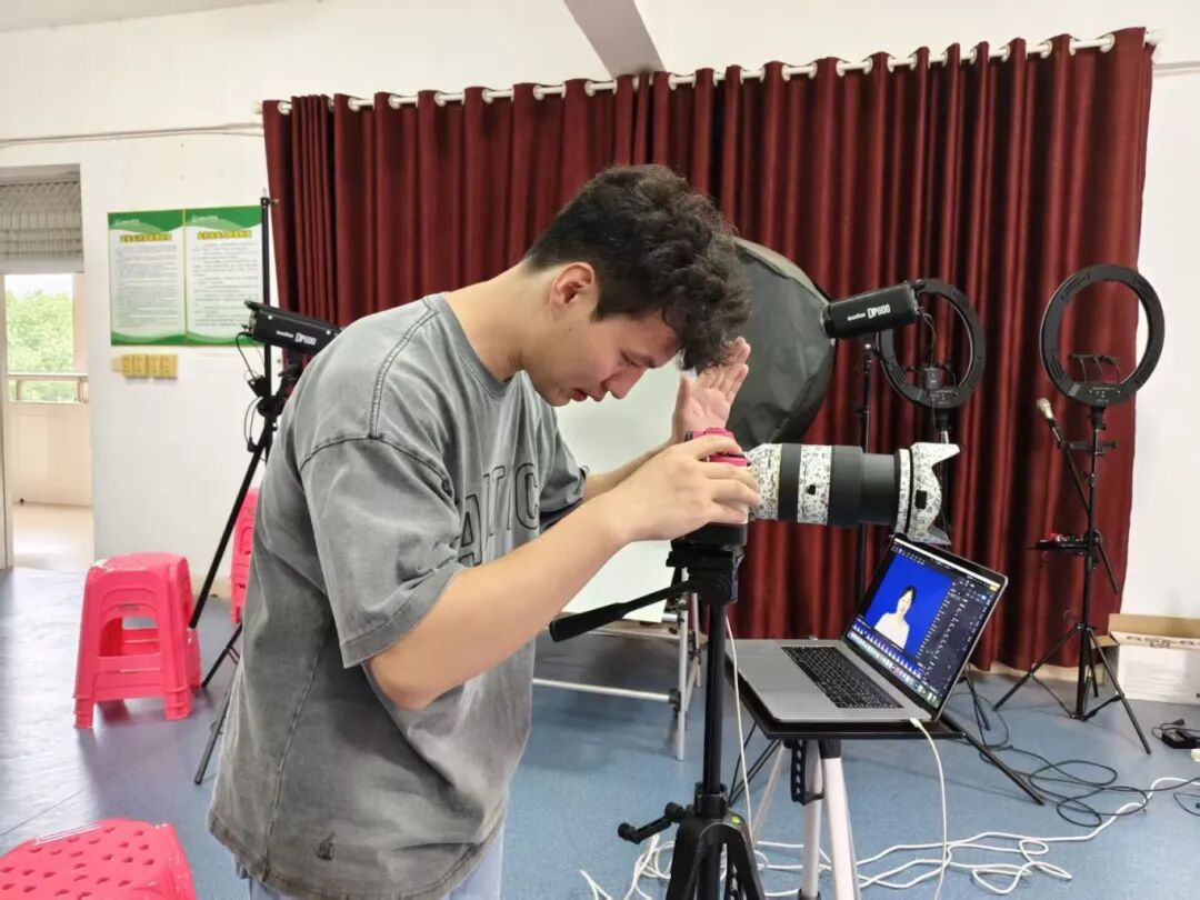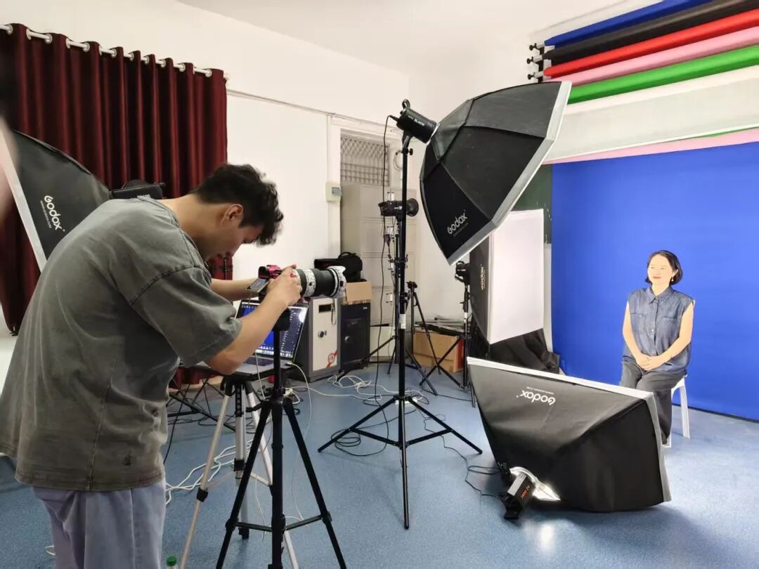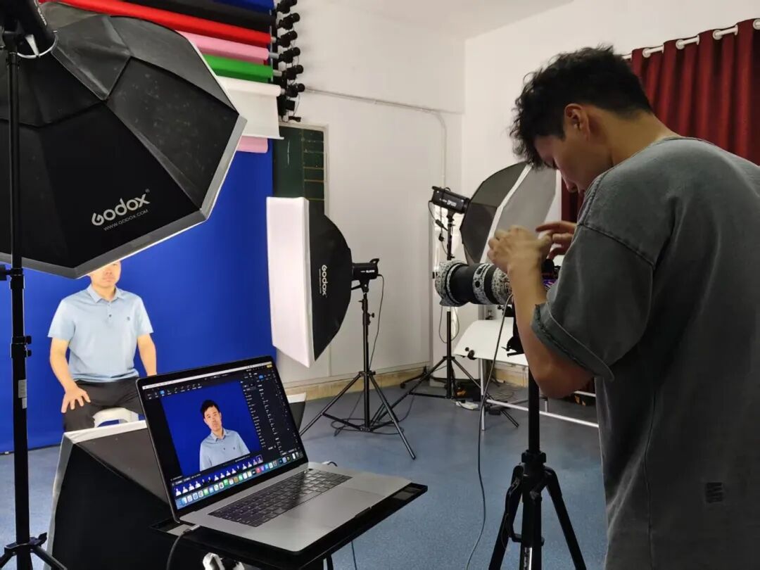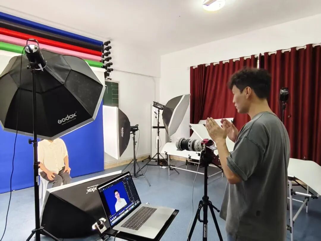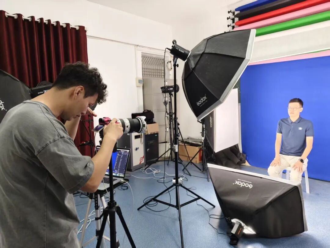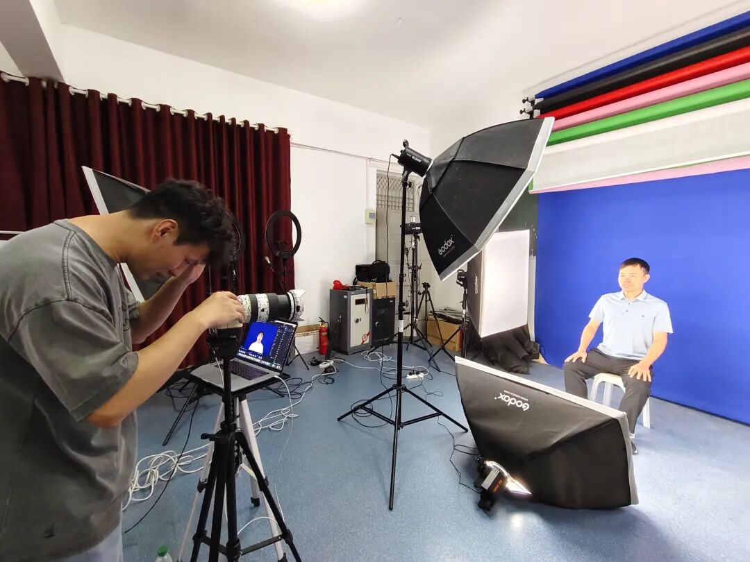 活动特邀公司新媒体课程中具有摄影特长的教师拍摄,现场还有4名员工志愿者参与。现场配备专业级补光灯、背景幕布及高清摄影设备,提供深色正装衬衫、领带等临时服饰配件。从光线调试到姿态矫正,从表情管理到后期修图,团队以"商务简约风"为标准,确保每张照片都符合证件照规范且展现教职工最佳精神面貌。