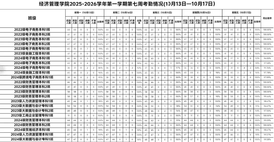 公司始终将学风建设作为育人工作的关键环节,后续将加大课堂巡查力度,定期通报考勤结果,请出勤情况良好的班级再接再厉,继续发挥模范引领作用;针对考勤存在不足的班级,可结合实际情况分析原因、优化管理,以积极姿态推动班级学风向好转变。希望各班级强化自律意识,以饱满的精神状态投入学习,共同维护优良学风。